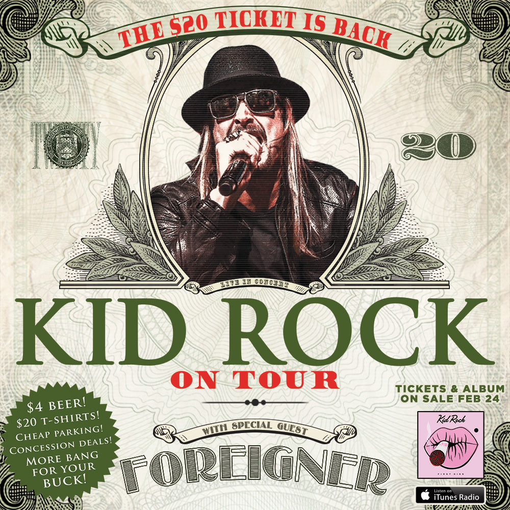 KID ROCK DOUBLES DOWN WITH MASSIVE $20 TICKET TOUR THIS SUMMER IN SUPPORT OF NEW ALBUM "FIRST KISS." 6 Hometown Shows at DTE Energy Music Theatre in August Also Announced The legendary FOREIGNER to support on all dates!! Stream Album “First Kiss” In Its Entirety on iTunes Radio Now DETROIT, MI (February 17th, 2015) Kid Rock broke all the rules when he last set out on...